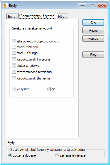 W tym oknie mogą zostać wybrane następujące wielkości dla brył: