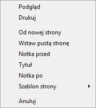 Gdy zostanie wybrana opcja Wstaw podział strony (), obiekt dodany do prawego panelu rozpocznie się na nowej stronie. Polecenia w menu kontekstowym mogą być także używane do wstawiania podziału strony. Kliknięcie panelu prawym przyciskiem myszy pozwala uzyskać dostęp do kilku innych opcji.