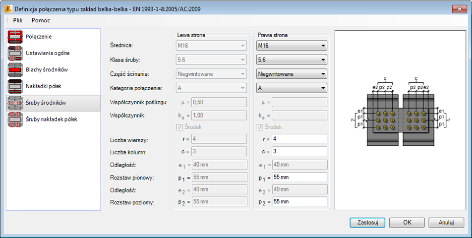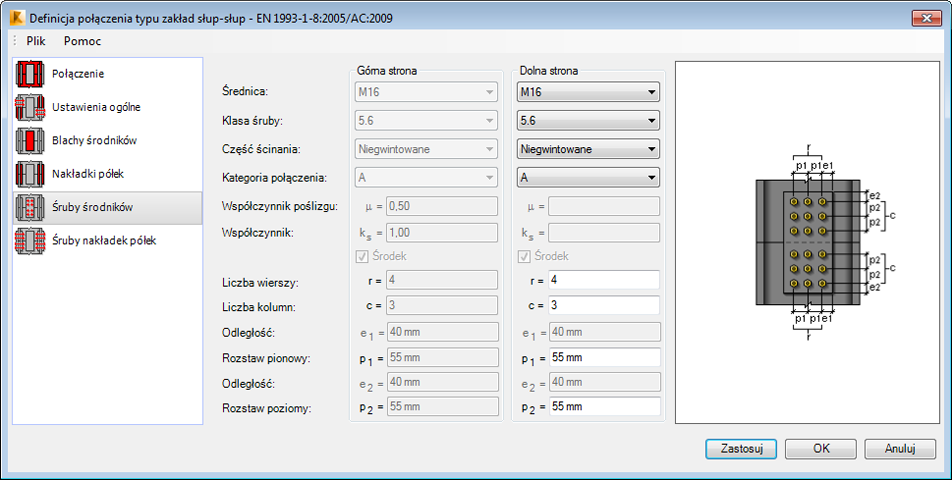 Panel Śruby środnika służy do definiowania parametrów śrub łączących nakładkę ze środnikami pręta.