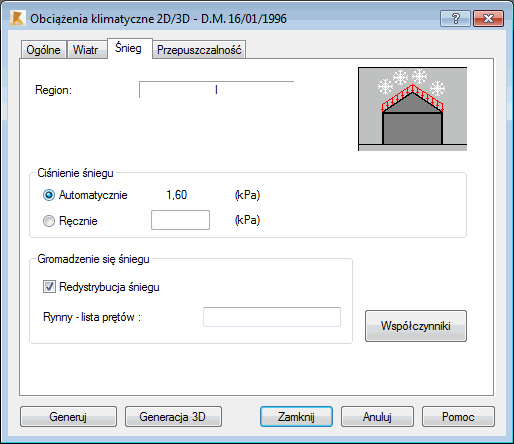 - Redystrybucja śniegu — opcja ta pozwala na generację obciążeń śniegiem z uwzględnieniem zsuwania się śniegu z nachylonych połaci dachowych, zwiewania śniegu przez wiatr oraz gromadzenia śniegu przez różne przeszkody na połaciach dachowych (rynny, naszczytniki). Standardowo obciążenia śniegiem są generowane z uwzględnieniem redystrybucji śniegu na połaciach dachowych.