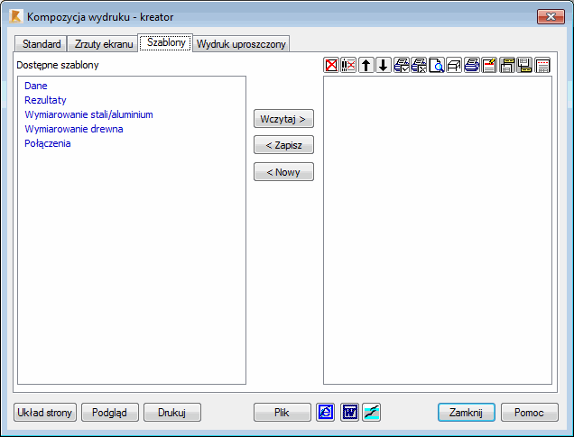 Powyższe okno dialogowe zostało podzielone na dwie części — lewy i prawy panel. W lewym panelu znajdują dostarczone razem z programem szablony całych wydruków. Szablony zawierają widoki/rysunki konstrukcji i odpowiednio zorganizowane tabele danych/wyników. Niektóre szablony umożliwiają wybór węzłów/prętów. Szablony predefiniowane prezentowane są w lewym panelu w kolorze niebieskim. Nie można ich usunąć, choć można je nadpisać. Jeżeli użytkownik utworzy szablon o nazwie istniejącego predefiniowanego szablonu (nazwa szablonu zostanie zmieniona na czarną — jest to kolor prezentacji szablonów zdefiniowanych przez użytkownika), a następnie usunie przygotowany przez siebie szablon, to nazwa nie zostanie usunięta (kolor zostanie zmieniony na niebieski) i przywrócona zostanie predefiniowana zawartość szablonu.