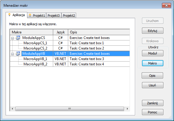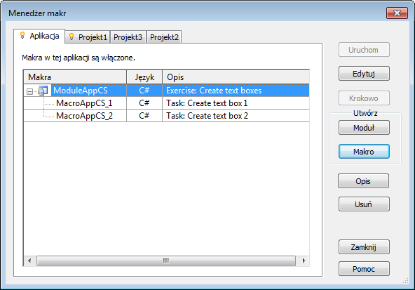 Menedżer makr służy do zarządzania makrami i uruchamiania ich.