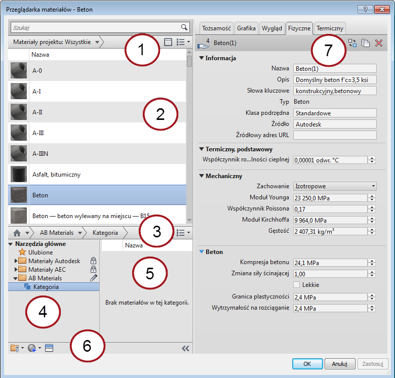 | 7 | Jeśli na liście bibliotek (lewy panel) został wybrany materiał, w prawym panelu wyświetlane są karty (zasoby) skojarzone z materiałem. Kliknij karty (na przykład Identyfikacja lub Wygląd), aby wyświetlić właściwości i zasoby materiału. Podczas przeglądania materiałów w bibliotekach właściwości mają status tylko do odczytu. |