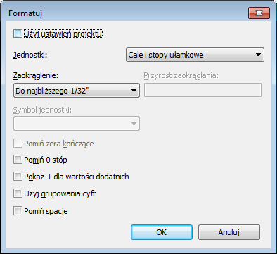 Opcja Użyj ustawień projektowych jest wybrana domyślnie. Oznacza to, że wartość wyświetla się zgodnie z ustawieniem Jednostek w projekcie.