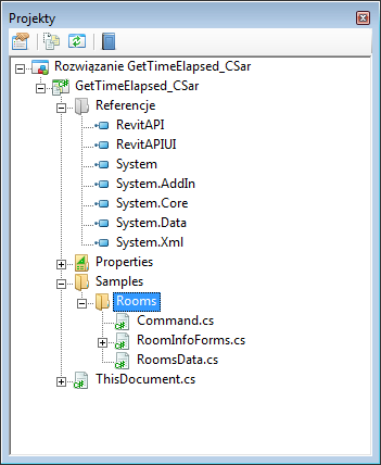Poza środowiskiem IDE użyj Eksploratora Windows, aby przejść do folderów instalacyjnych programu Revit oraz wyszukać folder AppHookup. Zwróć uwagę, że w tym położeniu \Samples\Roomszostaną utworzone odpowiednie podfoldery.
