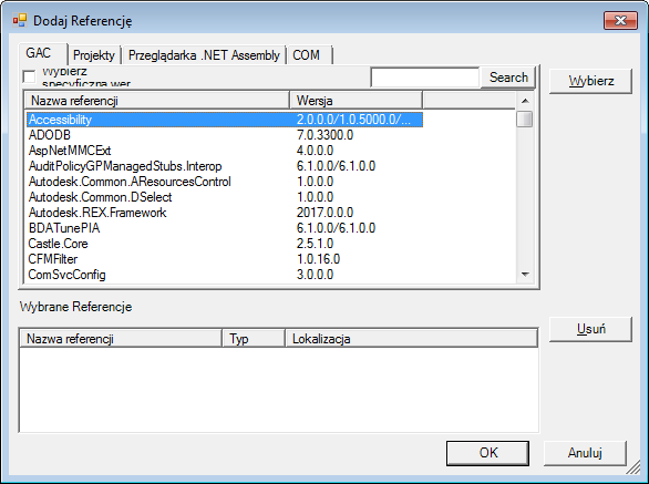 W oknie dialogowym Dodaj odniesienie znajdź i wybierz z listy System.Drawing i System.Windows.Forms. Aby wybrać wiele komponentów, przytrzymaj klawisz Ctrl. Przykładowo: