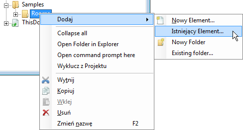 Nazwij folderu. W tym przykładzie nazywa się on Samples. Następnie prawym przyciskiem myszy kliknij pozycję folderu Samples i kliknij kolejno opcję Add