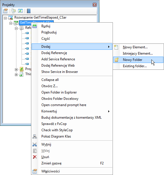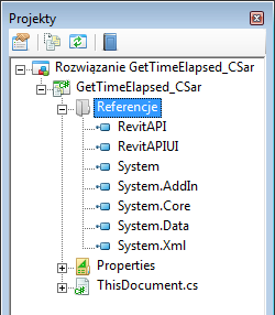 W tym przykładzie odświeżone środowisko IDE Project Explorer dla GetTimeElapsed_CSharp zawiera: