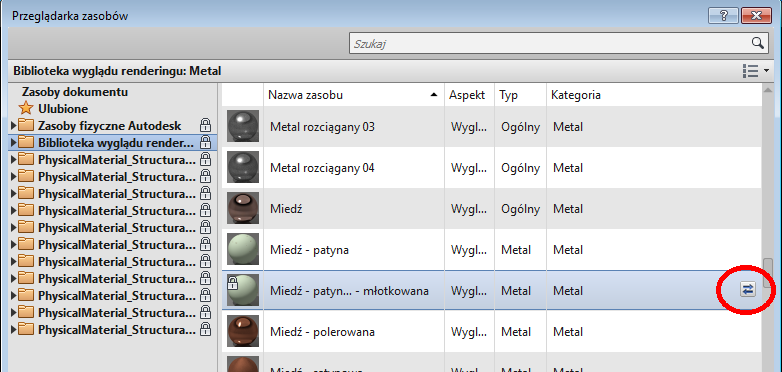 Istniejący zasób można zastąpić innym, wybranym z Przeglądarki zasobów. Materiał przyjmie właściwości nowego zasobu.