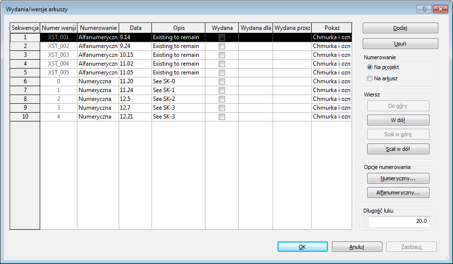 Można rozpocząć projekt, używając jednego schematu numeracji (np. liczbowego). Później można używać w projekcie innego schematu numeracji w celu wskazania innego etapu projektu. Numer kolejny wyświetlany w oknie dialogowym Wydania/zmiany arkusza określa ogólną sekwencję opartą na projekcie dla wszystkich zmian bez względu na indywidualne schematy numeracji.
