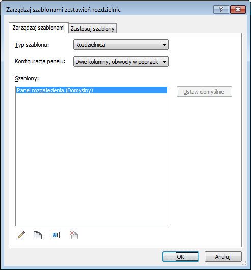Można użyć okna dialogowego Zarządzanie szablonami zestawień rozdzielnic, aby edytować, powielać, usuwać i stosować szablony zestawień rozdzielnic. Można także określić domyślny szablon.