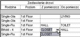 Zostanie otwarte zestawienie drzwi. Ponieważ pola Do pomieszczenia i Z pomieszczenia nie odzwierciedlają automatycznie zmian stronności drzwi wprowadzonych po umieszczeniu drzwi, pola te można edytować, wybierając wartość z listy.
