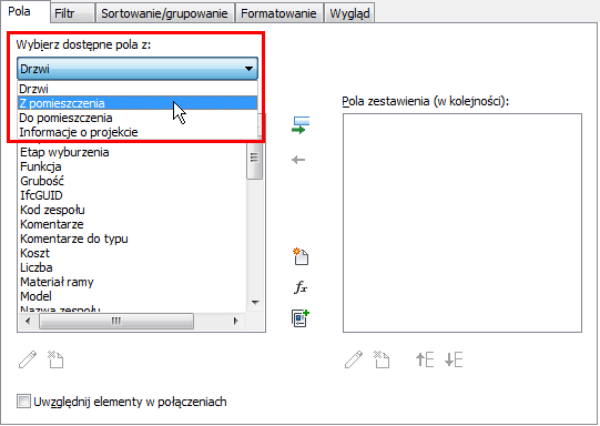 - Na karcie Pola dla opcji Wybierz dostępne pola z listy rozwijanej kliknij pozycję Z pomieszczenia lub Do pomieszczenia.