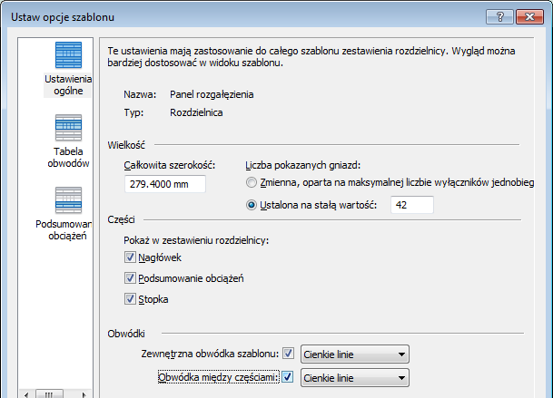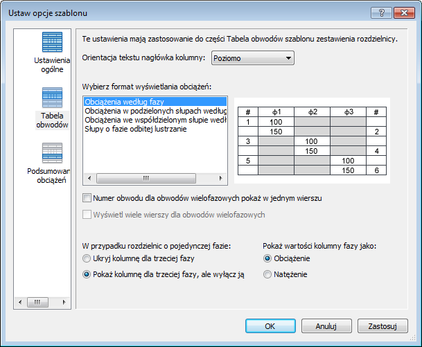 Wygląd zestawień rozdzielnic można dostosować. Można określić ustawienia ogólnego wyglądu, a także informacji o obwodzie i zestawienia obciążeń.