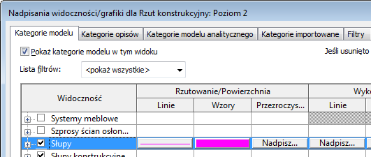 Na poniższej ilustracji kategoria Słupy ma nadpisania dla linii i wzorów rzutowania/powierzchni.