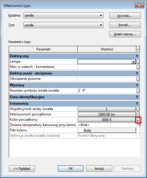- W oknie dialogowym Parametry i kategoria rodziny w obszarze Parametry rodziny wybierz opcję Źródło światła.
