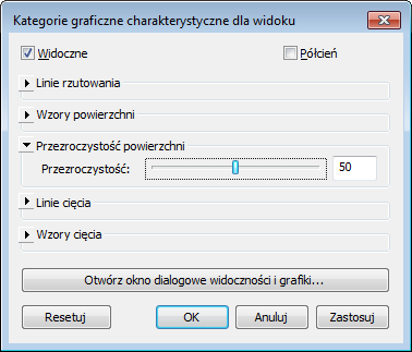 - Przezroczystość powierzchni: wyświetla linie tylko dla elementów, nie dla powierzchni. Użyj suwaka Przezroczystość, aby ustawić procent przezroczystości powierzchni.