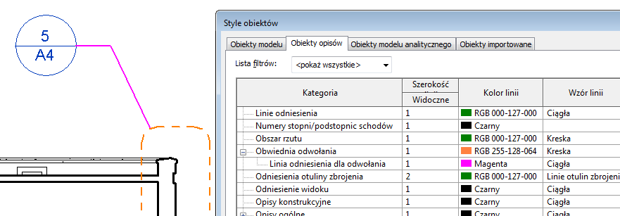 - W kolumnach Szerokość linii, Kolor linii i Wzór linii ustaw żądane opcje obwiedni odwołania, linii odniesienia odwołania i symboli odwołania.