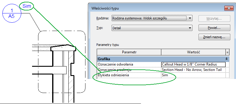 Istnieje możliwość zmiany sposobu wyświetlania oznaczenia odniesienia w oznaczeniu odwołania. Można także zmienić lub dodać szczegół odniesienia lub numery arkuszy do symbolu odwołania. W tym celu należy utworzyć rodzinę symboli odwołania i dodać etykiety zawierające te parametry.