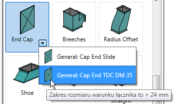 Kliknięcie strzałki powoduje wyświetlenie listy rozwijanej z dodatkowymi częściami w zależności od rozmiaru. Ta lista rozwijana jest zależna od warunków określonych w definicji usługi, podobne jak w przypadku preferencji przebiegu. Na przykład gięcie może użyć naciśniętego przycisku Gięcie w górę do określonego rozmiaru i Złożone gięcie powyżej tego rozmiaru. Po umieszczeniu kursora nad częścią na liście etykieta narzędzia wyświetla zakres wielkości w oparciu o warunek dla tej części.