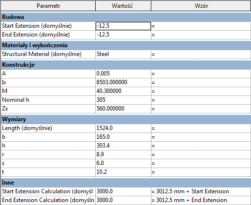 - Zapisz rodzinę. Po ponownym wczytaniu do projektu rodzina nie zawiera parametrów przedłużenia początku i końca, parametrów obliczeń przedłużenia ani uchwytów kształtu do edycji przedłużeń.