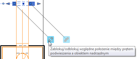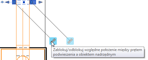 Po wybraniu podwieszenia produkcyjnego użyj elementów sterujących w obszarze rysunku, aby zmienić położenie elementu nośnego podwieszenia.