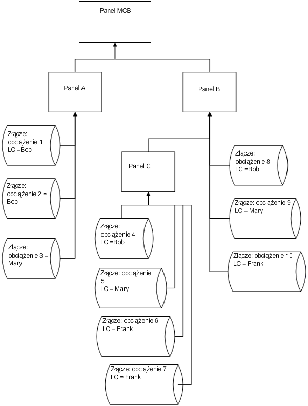 - Łączne dostarczone obciążenie = suma wszystkich obciążeń dołączonych do panelu (bezpośrednio lub do paneli podrzędnych)