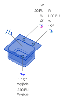Każde złącze układu ma etykietę i linię odniesienia, która wyświetla typ układu i dane złącza, typowy rozmiar, kierunek przepływu oraz jednostki przepływu/osprzętu.