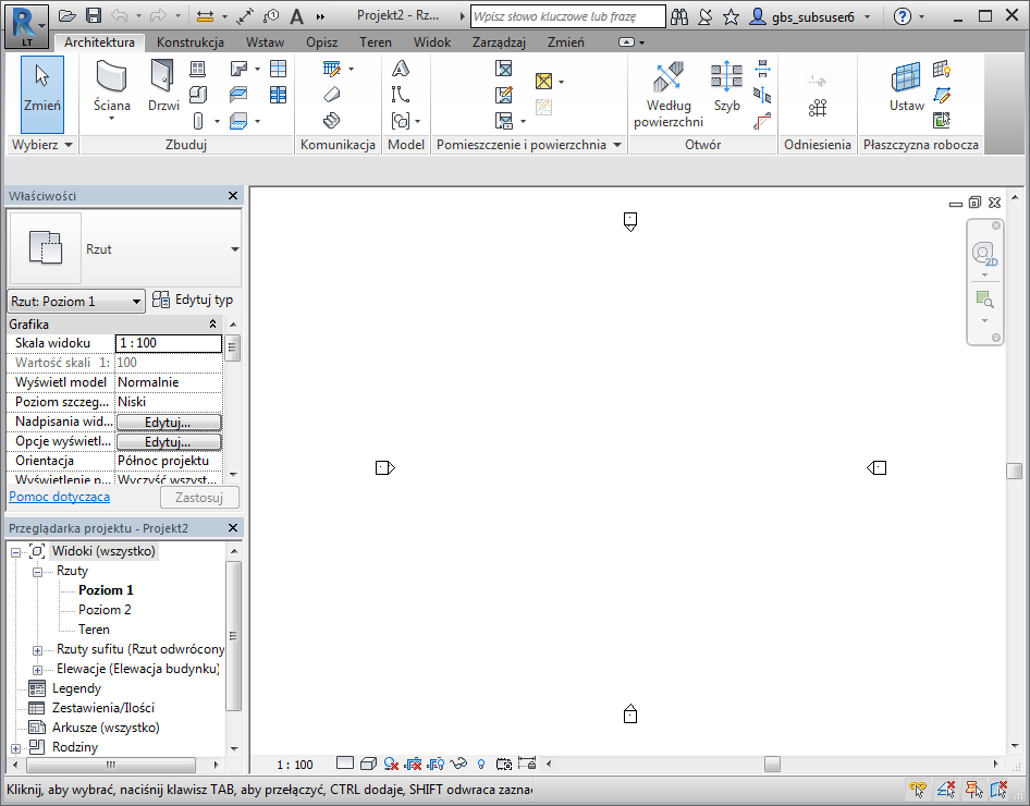 Obszar rysunku przedstawia widoki (oraz arkusze i zestawienia) bieżącego projektu. Widok otwierany w projekcie jest zawsze wyświetlany domyślnie w obszarze rysunku na wierzchu pozostałych otwartych widoków.