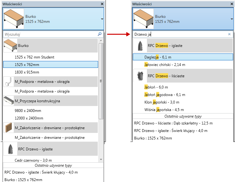 Kliknij przycisk lub listę rozwijaną Wybór typu. Kursor jest automatycznie ustawiany w polu wyszukiwania.