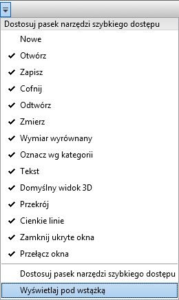 Pasek narzędzi szybkiego dostępu może być wyświetlany nad lub pod wstążką. Aby zmienić ustawienie, na pasku narzędzi Szybki dostęp kliknij kolejno listę rozwijaną Dostosuj pasek narzędzi Szybki dostęp