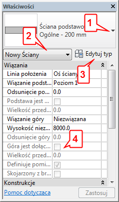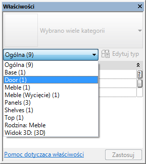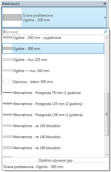 Jeśli jest aktywne narzędzie do umieszczania elementów lub w obszarze rysunku wybrano elementy tego samego typu, u góry palety Właściwości wyświetlana jest lista rozwijana Wybór typu. W polu jest wyświetlany aktualnie wybrany typ rodziny, jednak z listy rozwijanej można wybrać inny typ.