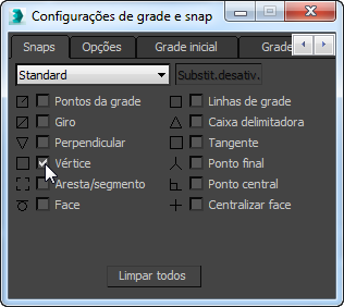 (Alternância de snaps) para exibir a caixa de diálogo Configurações de grade e snap. Na caixa de diálogo, clique em Limpar todos e clique para ativar Vértice.