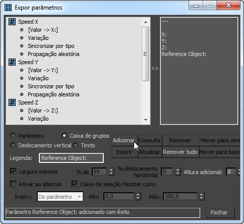 , legendando-o como Objeto de referência:. Defina a Largura como o valor máximo de 95 para que haja espaço suficiente para o botão e a legenda na implementação. Em seguida, selecione a Caixa do grupo. Finalmente, clique em Adicionar.