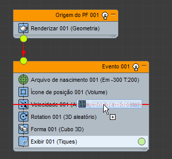 A implementação Ícone de dados 001 aparece na Vista de partículas.