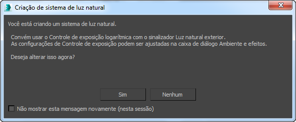 (Sistemas). Na implementação Tipo de objeto, clique no botão Luz do dia para ativá-lo. O 3ds Max exibe uma caixa de diálogo que pergunta se você deseja adicionar um controle de exposição Logarítmico à cena.