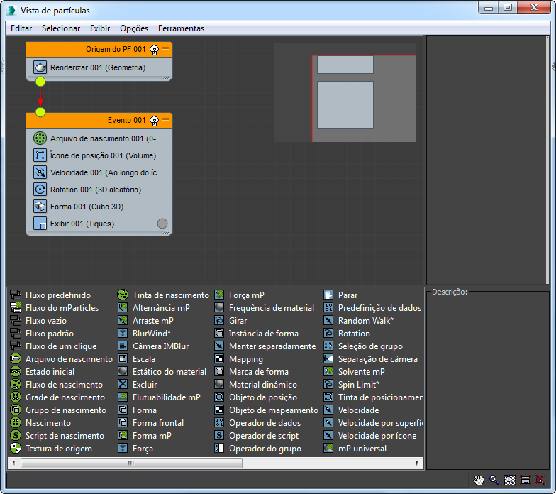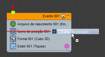 - O "depósito" é a lista de operadores e de testes que aparece na parte inferior da janela Vista de partículas. Arraste um operador Objeto de posição do depósito e, no Event 001, solte-o diretamente em cima do operador Position Icon 001.