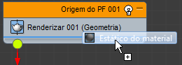 - Do depósito, arraste um operador Material estático para o evento PF Source 001. Solte-o logo abaixo do operador Render 001. Uma linha azul indica o ponto de inserção.