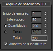 À direita da Vista de partículas, a implementação Birth 001 exibe parâmetros relacionados à criação de partículas. Os giradores Início da emissão e Parada da emissão indicam que a geração de partículas começará no quadro 0 e terminará no quadro 30. O girador Quantidade indica que 200 partículas serão geradas pelo sistema.