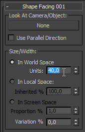 - Clique no operador Shape Facing 001 para realçá-lo. No grupo Tamanho/Largura, verifique se Espaço universal foi escolhido, altere o valor de Unidades para 40,0 e pressione Enter.