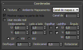 - Na implementação Coordenadas, desative Usar escala de mundo real se estiver ativado e verifique se Lado a lado foi definido como 1,0 para U e V.