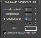 - Na implementação Birth 001, defina Parada de emissão como 0 (isso garante que as partículas não aparecerão com o tempo) e defina o girador Quantidade como 6, de forma que somente seis árvores de partícula sejam criadas.