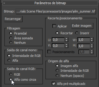 - Na implementação Parâmetros de bitmap, no grupo Saída do canal mono, escolha Alfa e, no grupo Saída de canal RGB, escolha Alfa como cinza.