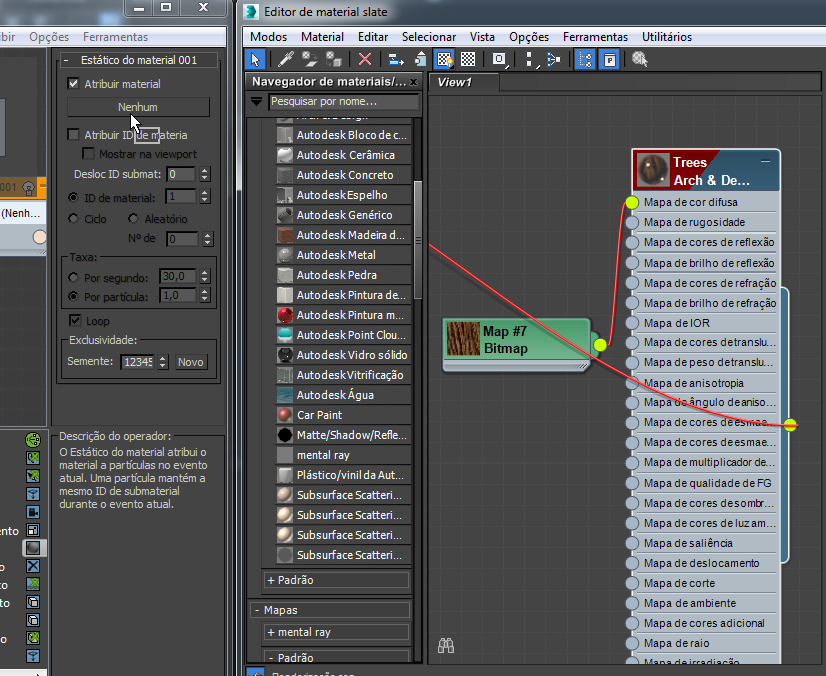 - Mova a Vista de partículas e o Editor de material Slate para poder ver ambas as janelas. Na Vista de partículas, realce o operador Material Static 001 e arraste a partir do soquete de saída do nó de material Árvores e, na Vista de partículas, solte o material no botão Atribuir material (inicialmente rotulado como "Nenhum"). Quando o 3ds Max perguntar se deve usar uma cópia ou uma instância, assegure-se de que Instância seja escolhida e clique em OK.