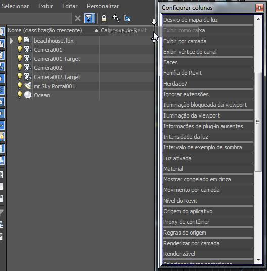 - Mova a caixa de diálogo Configurar colunas para a direita da janela do Scene Explorer.