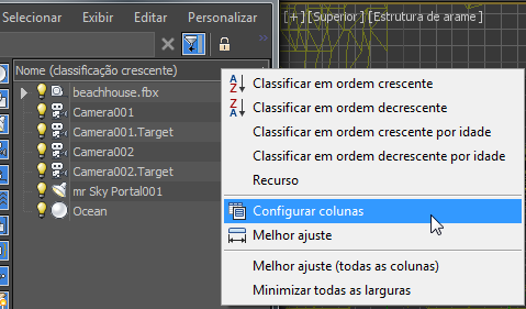 - No painel do Scene Explorer, clique com o botão direito do mouse no cabeçalho e, no menu suspenso, selecione Configurar colunas.