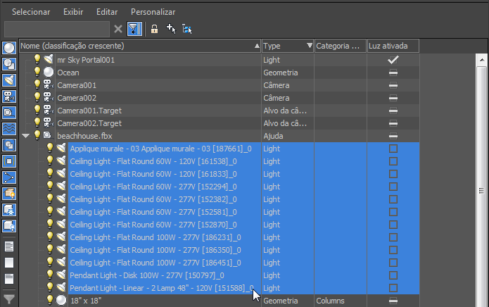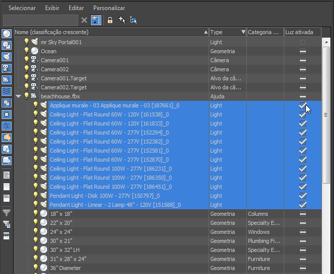Dica: Você também pode usar o Light Lister para acender e apagar luzes, mas no Scene Explorer é mais fácil selecionar múltiplos objetos de luz.