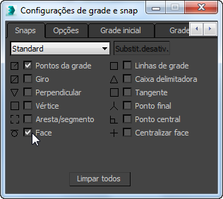 (Alterna snap) para abrir a caixa de diálogo Configurações de grade e snap. Na caixa de diálogo, clique em Limpar tudo e, em seguida, clique para ativar Face.
