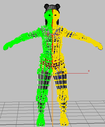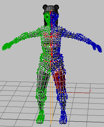 (Colar vértices azuis em verdes). Todas as pesagem realizadas para cada vértice no lado esquerdo do personagem foram copiados para as partes correspondentes no lado direito, corrigindo instantaneamente o revestimento de pele em todo esse lado. Os vértices do lado esquerdo, anteriormente azuis, são agora amarelos para indicar que foram espelhados: