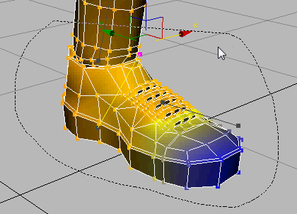 Como a caixa de seleção Vértices de seleção de faces traseiras está desativada, também é selecionada a maioria dos vértices voltados para fora. Dependendo do ângulo de visualização e onde você arrasta a região, alguns vértices podem não ser selecionados. Para assegurar-se de que todos os vértices do pé e do tornozelo sejam selecionados,